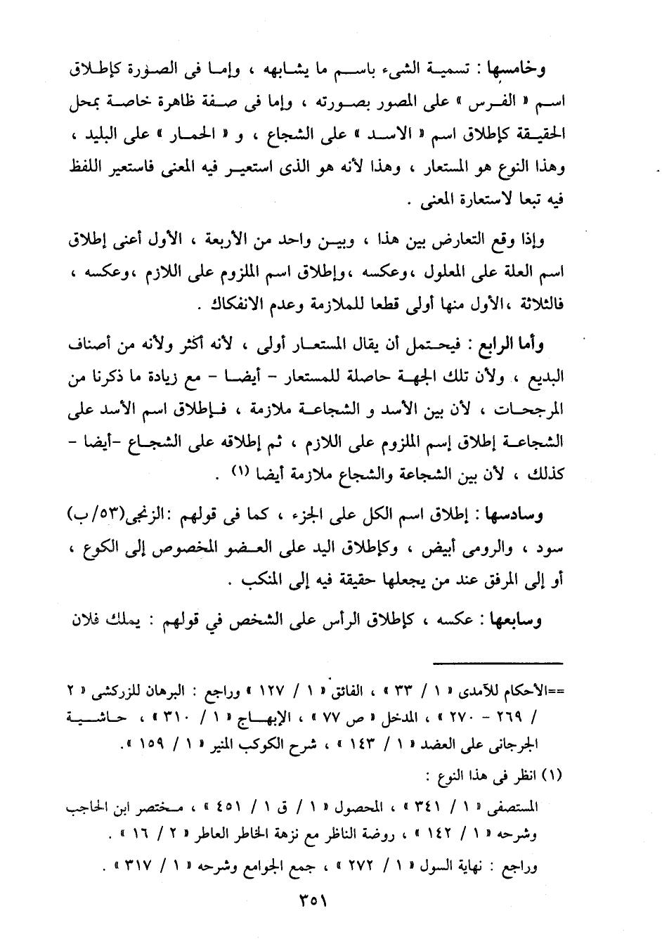 وأما الرابع: فيحتمل أن يقال المستعار أولى، لأنه أكثر ولأنه من أصناف البديع، ولأن تلك الجهة حاصلة للمستعار- أيضا- مع زيادة ما ذكرنا من المرجحات، لأن بين الأسد والشجاعة ملازمة، فإطلاق اسم الأسد على الشجاعة إطلاق إسم الملزوم على اللازم، ثم إطلاقه على الشجاع- أيضا- كذلك، لأن بين الشجاعة والشجاع ملازمة أيضا.