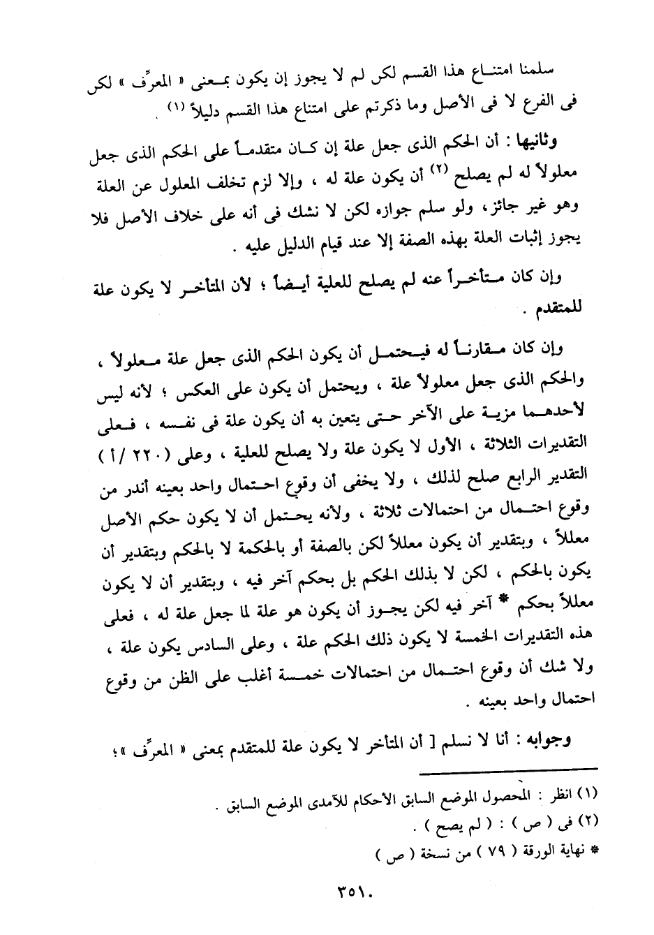 وثانيها: أن الحكم الذى جعل علة إن كان متقدما على الحكم الذى جعل معلولا له لم يصلح أن يكون علة له، وإلا لزم تخلف المعلول عن العلة وهو غير جائز، ولو سلم جوازه لكن لا نشك في أنه خلاف الأصل فلا يجوز إثبات العلة بهذه الصفة إلا عند قيام الدليل عليه.