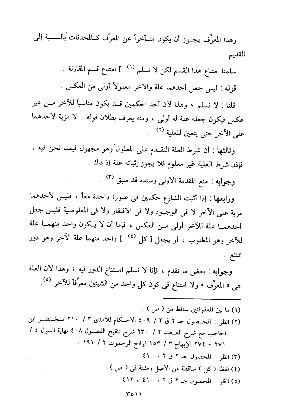 ورابعها: إذا أثبت الشارع حكمين في صورة واحدة معا، فليس لأحدهما مزية على الآخر لا في الوجود ولا الافتقار ولا في المعلومية فليس جعل أحدهما علة للآخر أولى من العكس، فإما أن لا يكون واحد منهما علة للآخر وهو المطلوب، أو يجعل] كل [واحد منهما علة الآخر وهو دور ممتنع.