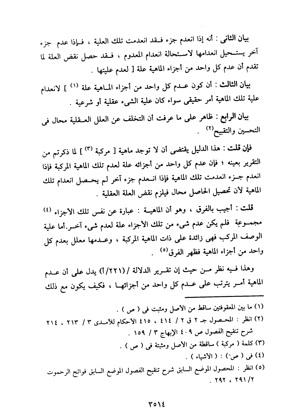 فإن قلت: هذا الدليل يقتضي أن لا توجد ماهية] مركبة [لما ذكرتم من التقرير بعينه؛ فإن عدم كل واحد من أجزائه علة لعدم تلك الماهية المركبة فإذا انعدم جزء انعدمت تلك الماهية فإذا انعدم جزء آخر لم يحصل انعدام تلك الماهية لأن تحصيل الحاصل محال فيلزم نقض العلة العقلية.