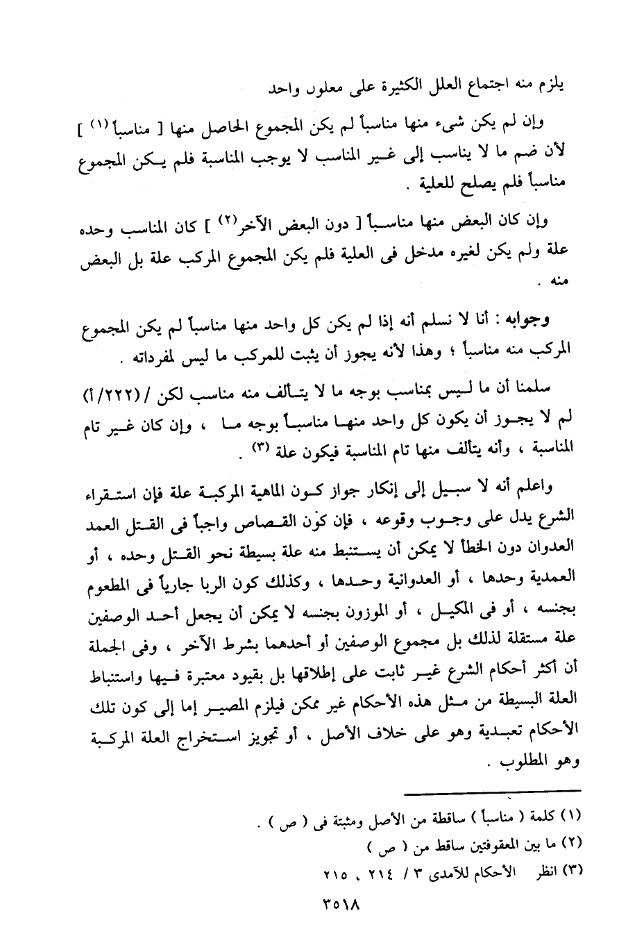 وأعلم أنه لا سبيل إلى إنكار جواز كون الماهية المركبة علة فإن استقراء الشرع يدل على وجوب وقوعه، فإن كون القصاص واجبا في القتل العمد العدوان دون الخطأ لا يمكن أن يستنبط منه علة بسيطة نحو القتل وحده، أو العمدية وحدها، أو العدوانية وحدها، وكذلك كون الربا جاريا في المطعوم بجنسه، أو في المكيل، أو الموزون بجنسه لا يمكن أن يجعل أحد الوصفين علة مستقلة لذلك بل مجموع الوصفين أو أحدهما بشرط الآخر، وفي الجملة أن أكثر أحكام الشرع غير ثابت على إطلاقها بل بقيود معتبرة فيها واستنباط العلة البسيطة من مثل هذه الأحكام غير ممكن فيلزم المصير إما إلى كون تلك الأحكام تعبدية وهو على خلاف الأصل، أو تجويز استخراج العلة المركبة وهو المطلوب.