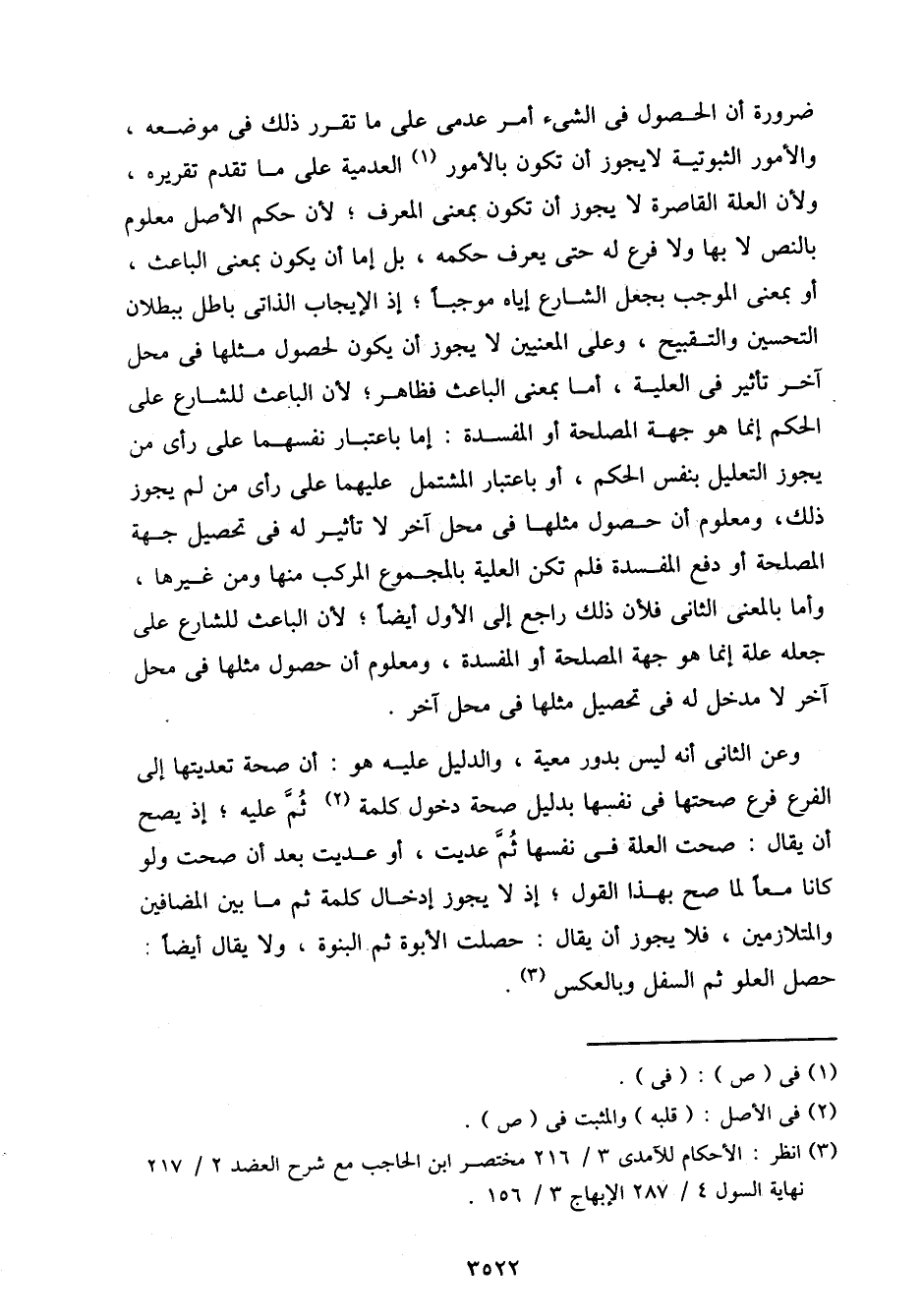 ضرورة أن الحصول في الشيء أمر عدمي على ما تقرر ذلك في موضعه، والأمور الثبوتية لا يجوز أن تكون بالأمور العدمية على ما تقدم تقريره، ولأن العلة القاصرة لا يجوز أن تكون بمعنى المعرف؛ لأن حكم الأصل معلوم بالنص لا بها ولا فرع له حتى يعرف حكمه، بل إما أن يكون بمعنى الباعث، أو بمعنى الموجب بجعل الشارع إياه موجبا؛ إذ الإيجاب الذاتي باطل ببطلان التحسين والتقبيح، وعلى المعنيين لا يجوز أن يكون لحصول مثلها في محل آخر تأثير في العلية، أما بمعنى الباعث فظاهر؛ لأن الباعث للشارع على الحكم إنما هو جهة المصلحة أو المفسدة: إما باعتبار نفسهما على رأي من يجوز التعليل بنفس الحكم، أو باعتبار المشتمل عليهما على رأي من لم يجوز ذلك، ومعلوم أن حصول مثلها في محل آخر لا تأثير له في تحصيل جهة المصلحة أو دفع المفسدة فلم تكن العلية بالمجموع المركب منها ومن غيرها، وأما بالمعنى الثاني فلأن ذلك راجع إلى الأول أيضا؛ لأن الباعث للشارع على جعله علة إنما هو جهة المصلحة أو المفسدة، ومعلوم أن حصول مثلها في محل آخر لا مدخل له في تحصيل مثلها في محل آخر.