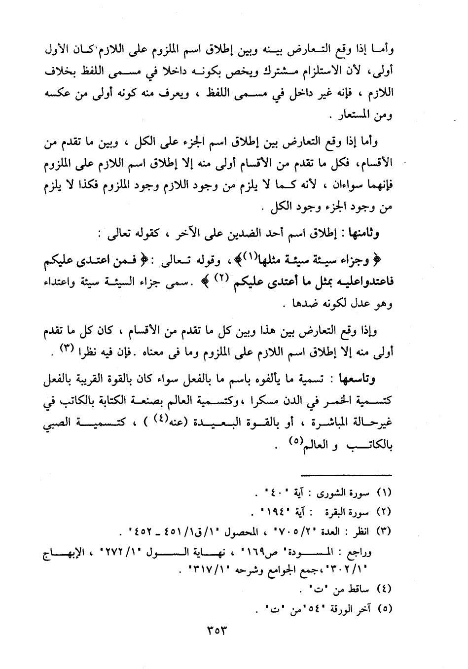 وأما إذا وقع التعارض بين إطلاق اسم الجزء على الكل، وبين ما تقدم من الأقسام، فكل ما تقدم من الأقسام أولى منه إلا إطلاق اسم اللازم على الملزوم فإنهما سواءان، لأنه كما لا يلزم من وجود اللازم وجود الملزوم فكذا لا يلزم من وجود الجزء وجود الكل.