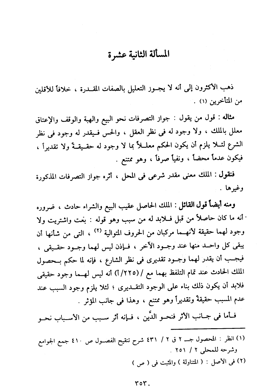 ومنه أيضا قول القائل: الملك الحاصل عقيب البيع والشراء حادث، ضروره أنه ما كان حاصلا من قبل فلابد له من سبب وهو قوله: بعت واشتريت ولا وجود لهما حقيقة لأنهما مركبان من الحروف المتوالية، التى من شأنها أن يبقى كل واحد منها عند وجود الآخر، فإذا ليس لهما وجود حقيقي، فيجب أن يقدر لهما وجود تقديري في نظر الشارع، فإنه لما حكم بحصول الملك الحادث عند تمام التلفظ بهما مع/ (225/أ) أنه ليس لهما وجود حقيقى فلابد أن يكون ذلك بناء على الوجود التقديري؛ لئلا يلزم وجود السبب عند عدم المسبب حقيقة وتقديرا وهو ممتنع، وهذا في جانب المؤثر.
