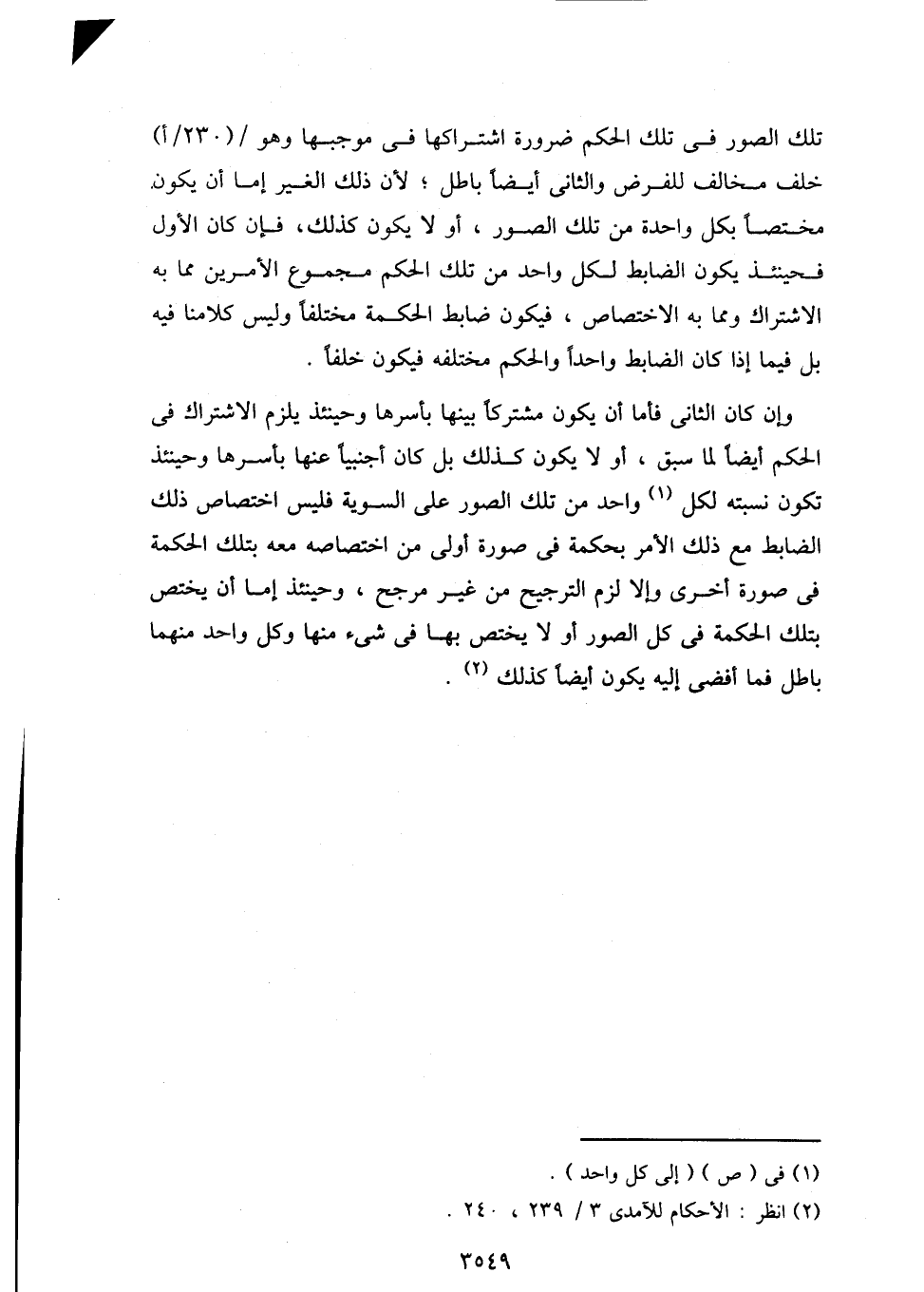 تلك الصور في تلك الحكم ضرورة اشتراكها في موجبها وهو/ (230/أ) خلف مخالف للفرض والثاني أيضا باطل؛ لأن ذلك الغير إما أن يكون مختصا بكل واحدة من تلك الصور، أو لا يكون كذلك، فإن كان الأول فحينئذ يكون الضابط لكل واحد من تلك الحكم مجموع الأمرين مما به الاشتراك ومما به الاختصاص، فيكون ضابط الحكمة مختلفا وليس كلامنا فيه بل فيما إذا كان الضابط واحدا والحكم مختلفه فيكون خلفا.