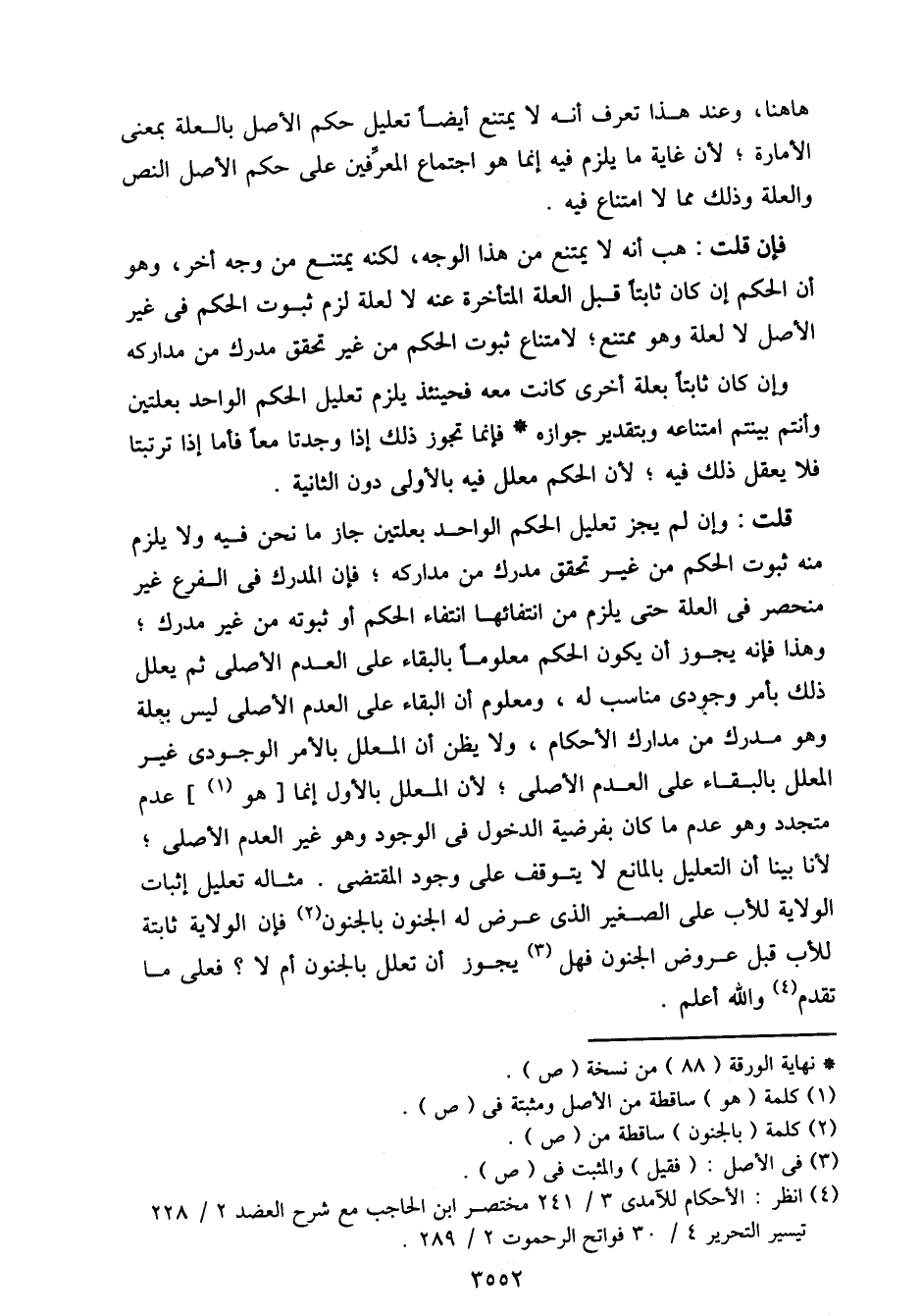 قلت: وإن لم يجز تعليل الحكم الواحد بعلتين جاز ما نحن فيه ولا يلزم منه ثبوت الحكم من غير تحقق مدرك من مداركه؛ فإن المدرك في الفرع غير منحصر في العلة حتى يلزم من انتفائها انتفاء الحكم أو ثبوته من غير مدرك؛ وهذا فإنه يجوز أن يكون الحكم معلومًا بالبقاء على العدم الأصلي ثم يعلل ذلك بأمر وجودي مناسب له، ومعلوم أن البقاء على العدم الأصلي ليس بعلة وهو مدرك من مدارك الأحكام، ولا يظن أن المعلل بالأمر الوجودي غير المعلل بالبقاء على العدم الأصلي؛ لأن المعلل بالأول إنما [هو] عدم متجدد وهو عدم ما كان بفرضية الدخول في الوجود وهو غير العدم الأصلي؛ لأنا بينا أن التعليل بالمانع لا يتوقف على وجود المقتضى. مثاله تعليل إثبات الولاية للأب على الصغير الذي عرض له الجنون بالجنون فإن الولاية ثابتة للأب قبل عروض الجنون فهل يجوز أن تعلل بالجنون أم لا؟ فعلى ما تقدم والله أعلم.