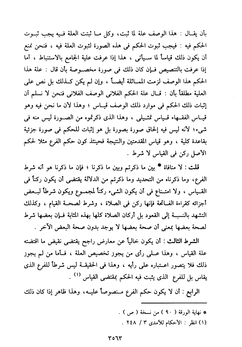 الشرط الثالث: أن يكون خاليًا عن معارض راجح يقتضى نقيض ما اقتضته علة القياس، وهذا على رأى من يجوز تخصيص العلة، فأما من لم يجوز ذلك فلا يتصور اعتباره على رأيه، وهذا في الحقيقة ليس شرطًا للفرع الذي يقاس بل للفرع الذي يثبت فيه الحكم بمقتضى القياس.
