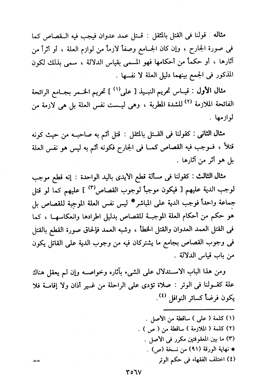 مثال الثالث: كقولنا في مسألة قطع الأيدي باليد الواحدة: إنه قطع موجب لوجب الدية عليهم [فيكون موجبًا لوجوب القصاص] عليهم كما لو قتل جماعة واحدًا فوجب الدية على المباشر ليس نفس العلة الموجبة للقصاص بل هو حكم من أحكام العلة الموجبة للقصاص بدليل أطرادها وانعكاسها، كما في القتل العمد العدوان والقتل الخطأ، وشبه العمد فإلحاق صورة القطع بالقتل في وجوب القصاص بجامع ما يشتركان فيه من وجوب الدية على القاتل يكون من باب قياس الدلالة.