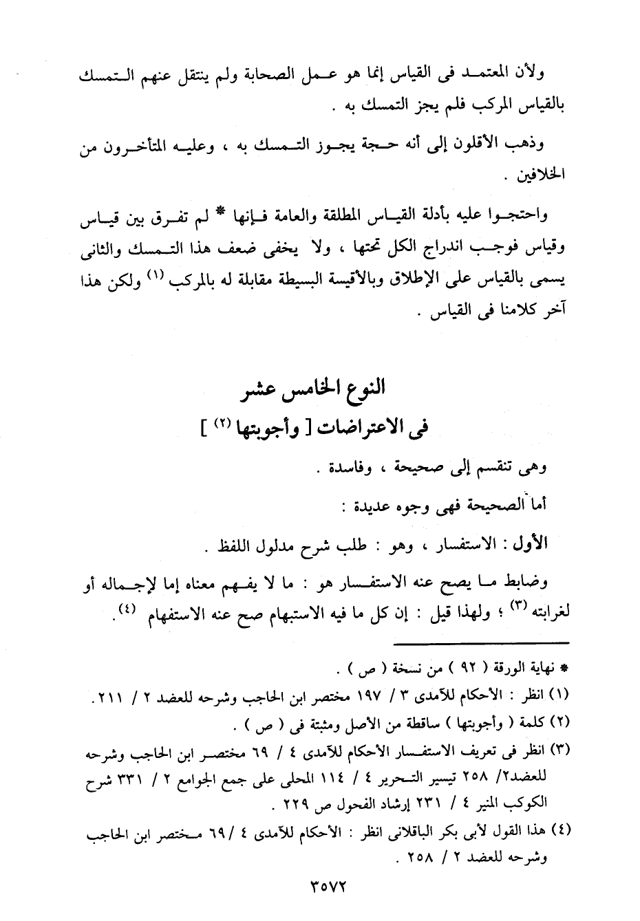 واحتجوا عليه بأدلة القياس المطلقة والعامة فإنها لم تفرق بين قياس وقياس فوجب اندراج الكل تحتها، ولا يخفى ضعف هذا التمسك والثاني يسمى بالقياس على الإطلاق وبالأقيسة البسيطة مقابلة له بالمركب ولن هذا آخر كلامنا في القياس.