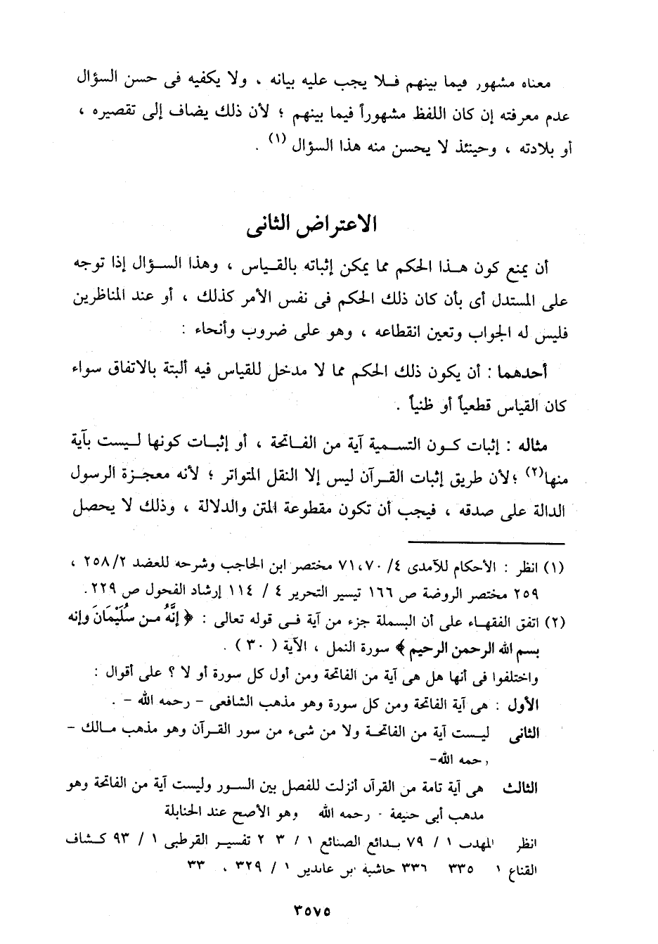 مثاله: إثبات كون التسمية آية من الفاتحة، أو إثبات كونها ليست بآية منها؛ لأن طريق إثبات القرآن ليس إلا النقل المتواتر؛ لأنه معجزة الرسول الدالة على صدقه، فيجب أن تكون مقطوعة المتن والدلالة، وذلك لا يحصل
