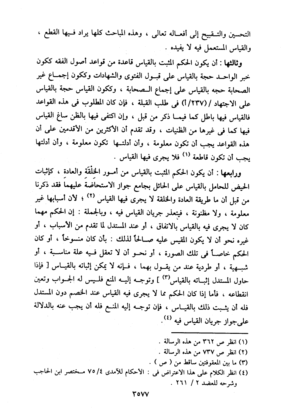 وثالثها: أن يكون الحكم المثبت بالقياس قاعدة من قواعد أصول الفقه ككون خبر الواحد حجة بالقياس على قبول الفتوى والشهادات وككون إجماع غير الصحابة حجه بالقياس على إجماع الصحابة، وككون القياس حجة بالقياس على الاجتهاد/ (237/ أ) في طلب القبلة، فإن كان المطلوب في هذه القواعد فالقياس فيها باطل كما فيما ذكر من قبل، وإن اكتفى فيها بالظن ساغ القياس فيها كما في غيرها من الظنيات، وقد تقدم أن الأكثرين من الأقدمين على أن هذه القواعد يجب أن تكون معلومة، وأن أدلتها تكون معلومة، وأن أدلتها يجب أن تكون قاطعة فلا يجرى فيها القياس.