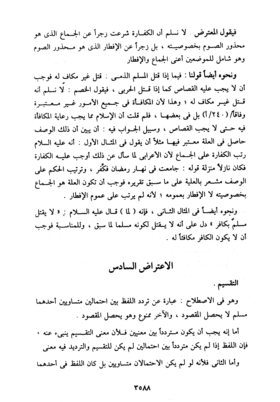 ونحوه أيضًا قولنا: فيما إذا قتل المسلم الذمي: قتل غير مكافٍ له فوجب أن لا يجب عليه القصاص كما إذا قتل الحربي، فيقول الخصم: لا نسلم أنه قتل غير مكاف له؛ وهذا لأن المكافأة في جميع الأمور غير معتبرة وفاقًا/ (240/ أ) بل في بعضها، فلم قلت أن الإسلام مما يجب رعاية المكافأة فيه حتى لا يجب القصاص، وسبيل الجواب فيه: أن يبين أن ذلك الوصف حاصل في العلة معتبر فيها مثلاً أن يقول في المثال الأول: أنه عليه السلام رتب الكفارة على الجماع لأن الأعرابي لما سأل عن ذلك أوجب عليه الكفارة كان نازلاً منزلة قوله: جامعت في نهار رمضان فكفر، وترتيب الحكم على الوصف مشعر بالعلية على ما سبق تقريره فوجب أن تكون العلة هو الجماع بخصوصيته لا الإفطار بعمومه؛ لأنه لم يترتب على عموم الإفطار.