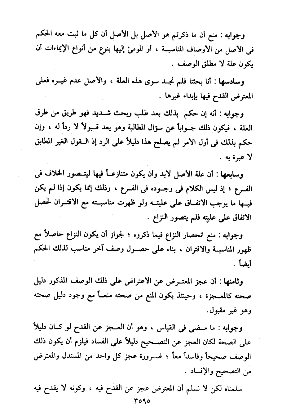 وثامنها: أن عجز المعترض عن الاعتراض على ذلك الوصف المذكور دليل صحته كالمعجزة، وحينئذ يكون المنع من صحته منعًا مع وجود دليل صحته وهو غير مقبول.