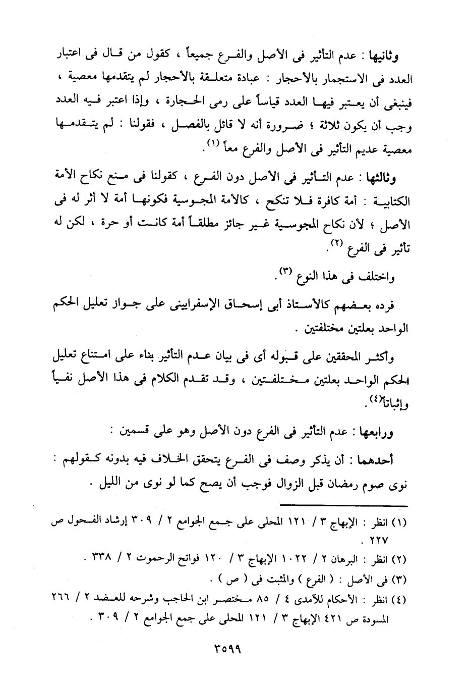 وثالثها: عدم التأثير في الأصل دون الفرع، كقولنا في منع نكاح الأمة الكتابية: أمة كافرة فلا تنكح، كالأمة المجوسية فكونها أمة لا أثر له في الأصل؛ لأن نكاح المجوسية غير جائز مطلقًا أمة كانت أو حرة، لكن له تأثير في الفرع.