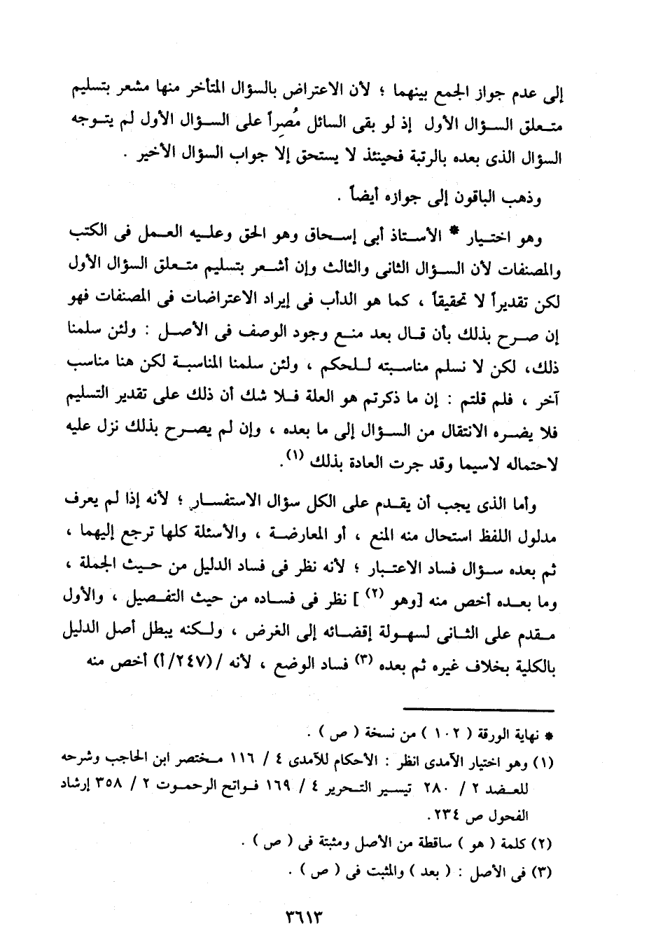 وهو اختيار الأستاذ أبى إسحاق وهو الحق وعليه العمل في الكتب والمصنفات لأن السؤال الثاني والثالث وإن أشعر بتسليم متعلق السؤال الأول لكن تقديرًا لا تحقيقًا، كما هو الدأب في إيراد الاعتراضات في المصنفات فهو إن صرح بذلك بان قال بعد منع وجود الوصف في الأصل: ولئن سلمنا ذلك، لكن لا نسلم مناسبته للحكم، ولئن سلمنا المناسبة لكن هنا مناسب آخر، فلم قلتم: إن ما ذكرتم هو العلة فلا شك أن ذلك على تقدير التسليم فلا يضره الانتقال من السؤال إلى ما بعده، وإن لم يصرح بذلك نزل عليه لاحتماله لاسيما وقد جرت العادة بذلك.
