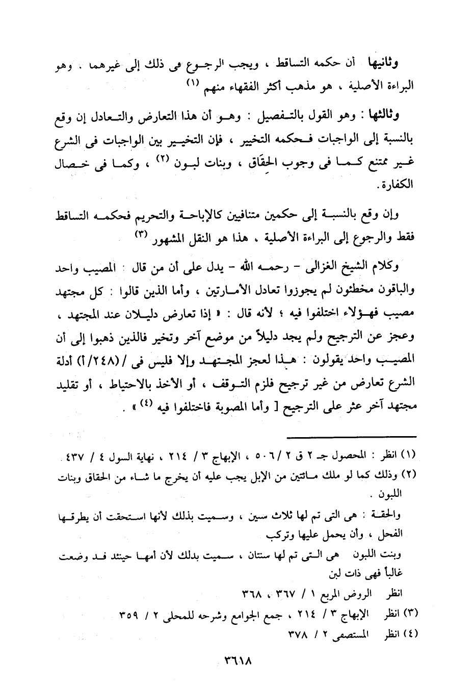 وكلام الشيخ الغزالي - رحمه الله - يدل على أن من قال: المصيب واحد والباقون مخطئون لم يجوزوا تعادل الأمارتين، وأما الذين قالوا: كل مجتهد مصيب فهؤلاء اختلفوا فيه؛ لأنه قال: (إذا تعارض دليلان عند المجتهد، وعجز عن الترجيح ولم يجد دليلاً من موضع آخر وتخير فالذين ذهبوا إلى أن المصيب واحد يقولون: هذا لعجز المجتهد وإلا فليس في/ (248/ أ) أدلة الشرع تعارض من غير ترجيح فلزم التوقف، أو الاخذ بالاحتياط، أو تقليد مجتهد آخر عثر على الترجيح [وأما المصوبة فاختلفوا فيه).