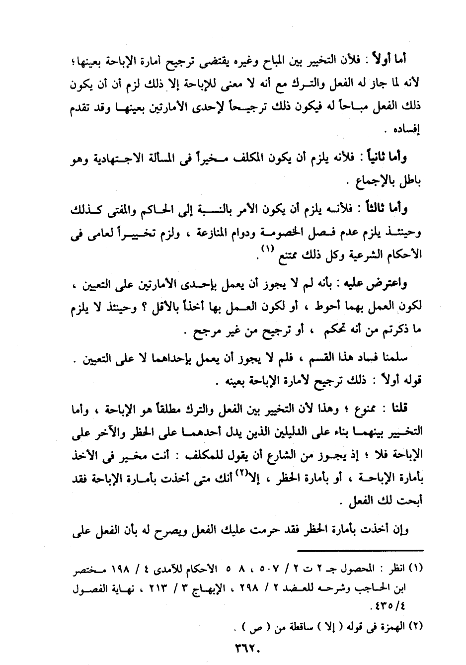 أما أولاً: فلأن التخيير بين المباح وغيره يقتضى ترجيح أمارة الإباحة بعينها؛ لأنه لما جاز له الفعل والترك مع أنه لا معنى للإباحة إلا ذلك لزم أن يكون ذلك الفعل مباحا له فيكون ذلك ترجيحا لإحدى الأمارتين بعينها وقد تقدم إفساده.