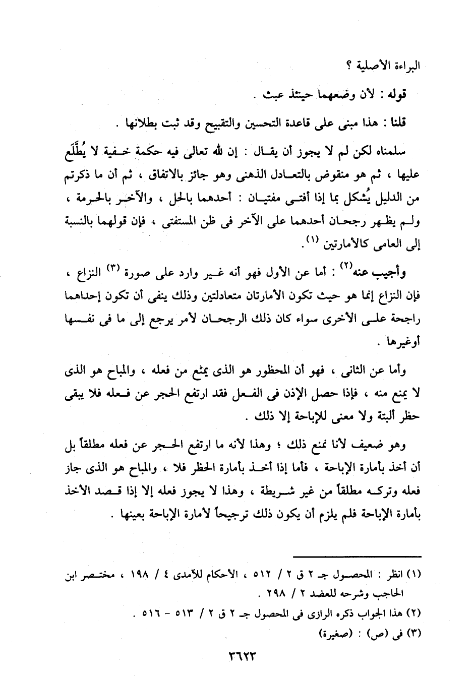 وأما عن الثاني، فهو أن المحظور هو الذى يمنع من فعله، والمباح هو الذى لا يمنع منه، فإذا حصل الإذن في الفعل فقد ارتفع الحجر عن فعله فلا يبقى حظر ألبتة ولا معنى للإباحة إلا ذلك.