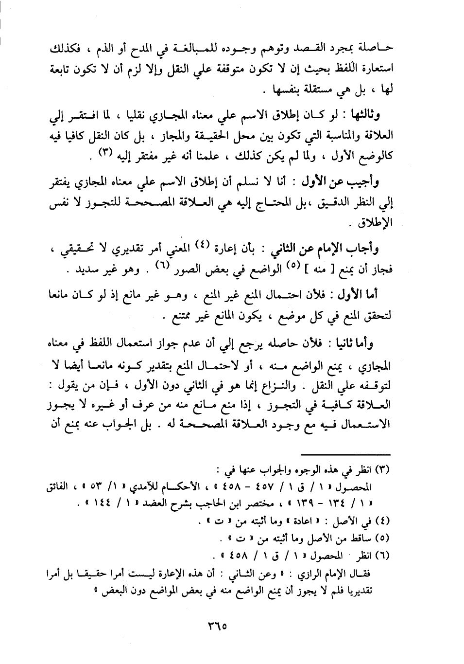 وأما ثانيا: فلأن حاصله يرجع إلى أن عدم جواز استعمال اللفظ في معناه المجازي، يمنع الواضع منه، أو لاحتمال المنع بتقدير كونه مانعا أيضا لا لتوقفه على النقل. والنزاع إنما هو في الثاني دون الأول، فإن من يقول: العلاقة كافية في التجوز، إذا منع مانع منه من عرف أو غيره لا يجوز الاستعمال فيه مع وجود العلاقة المصححة له. بل الجواب عنه بمنع أن