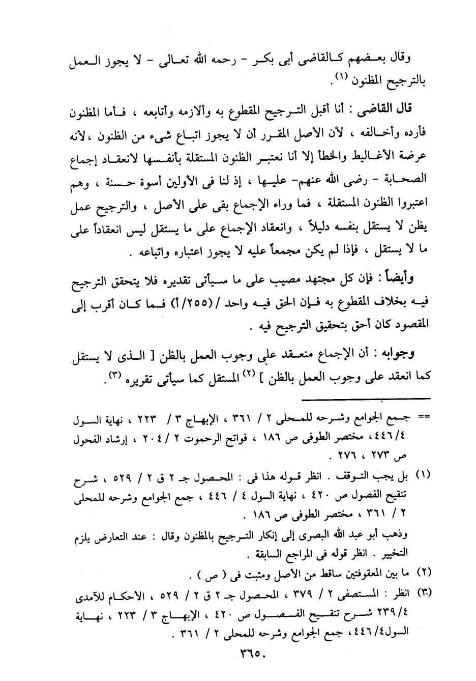 قال القاضي: أنا أقبل الترجيح المقطوع به وألازمه وأتابعه، فأما المظنون فأرده وأخالفه، لأن الأصل المقرر أن لا يجوز إتباع شيء من الظنون، لأنه عرضة الأغاليط والخطأ إلا أنا نعتبر الظنون المستقلة بأنفسها لانعقاد إجماع الصحابة- رضى الله عنهم- عليها، إذ لنا في الأولين أسوة حسنة، وهم اعتبروا الظنون المستقلة، فما وراء الإجماع بقى على الأصل، والترجيح عمل يظن لا يستقل بنفسه دليلاً، وانعقاد الإجماع على ما يستقل ليس انعقادًا على ما لا يستقل، فإذا لم يكن مجمعًا عليه لا يجوز اعتباره واتباعه.