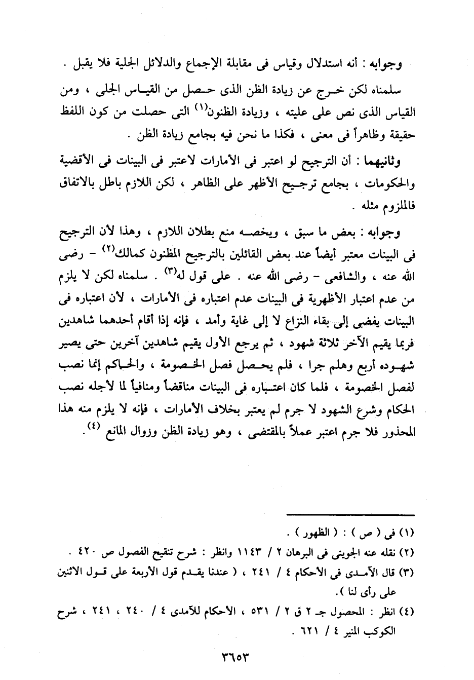 وجوابه: بعض ما سبق، ويخصه منع بطلان اللازم، وهذا لأن الترجيح في البينات معتبر أيضًا عند بعض القائلين بالترجيح المظنون كمالك- رضى الله عنه، والشافعي- رضى الله عنه. على قول له. سلمناه لكن لا يلزم من عدم اعتبار الأظهرية في البينات عدم اعتباره في الأمارات، لأن اعتباره في البينات يفضي إلى بقاء النزل لا إلى غاية وأمد، فإنه إذا أتام أحدهما شاهدين فربما يقيم الأخر ثلاثة شهود، ثم يرجع الأول يقيم شاهدين آخرين حتى يصير شهوده أربع وهلم جرا، فلم يحصل فصل الخصومة، والحاكم إنما نصب لفصل الخصومة، فلما كان اعتباره في البينات مناقضا ومنافيا لما لأجله نصب الحكام وشرع الشهود لا جرم لم يعتبر بخلاف الأمارات، فإنه لا يلزم منه هذا المحذور فلا جرم اعتبر عملاً بالمقتضى، وهو زيادة الظن وزوال المانع.