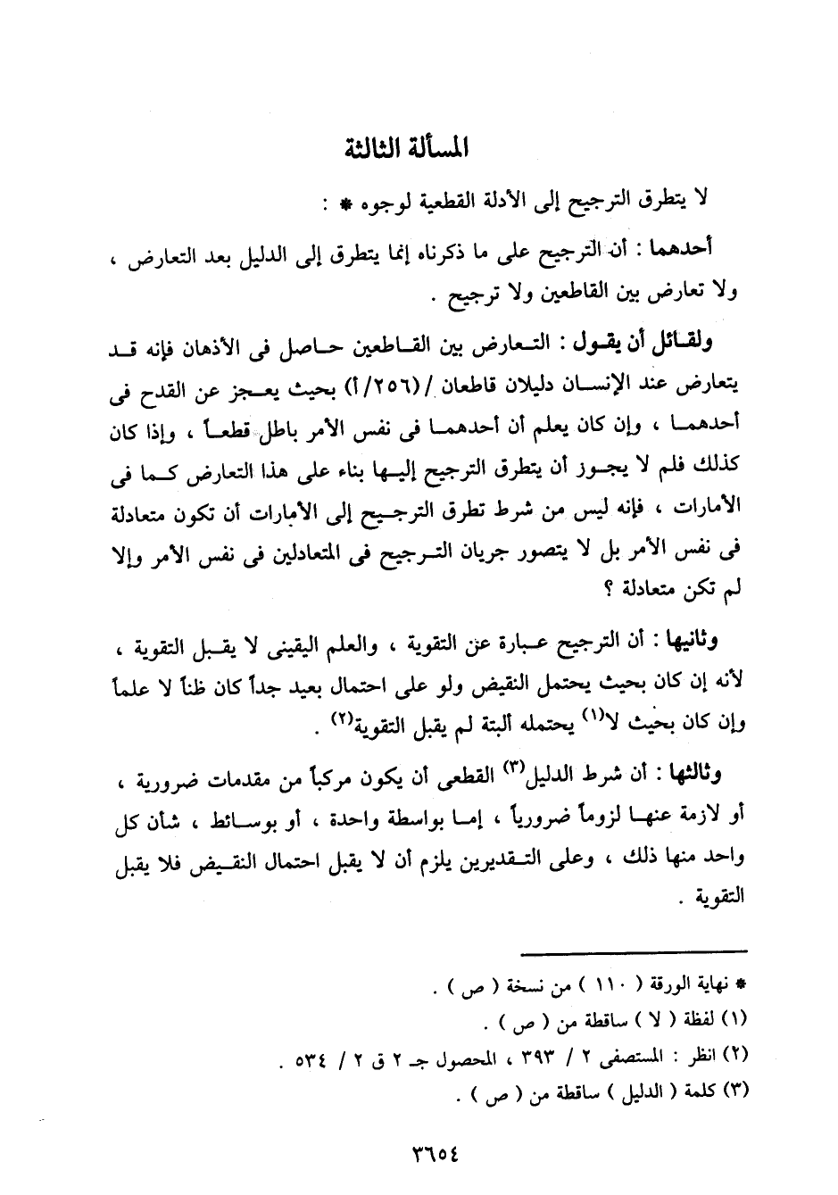 وثالثها: أن شرط الدليل القطعي أن يكون مركبا من مقدمات ضرورية، أو لازمة عنها لزومًا ضروريًا، إما بواسطة واحدة، أو بوسائط، شأن كل واحد منها ذلك، وعلى التقديرين يلزم أن لا يقبل احتمال النقيض فلا يقبل التقوية.