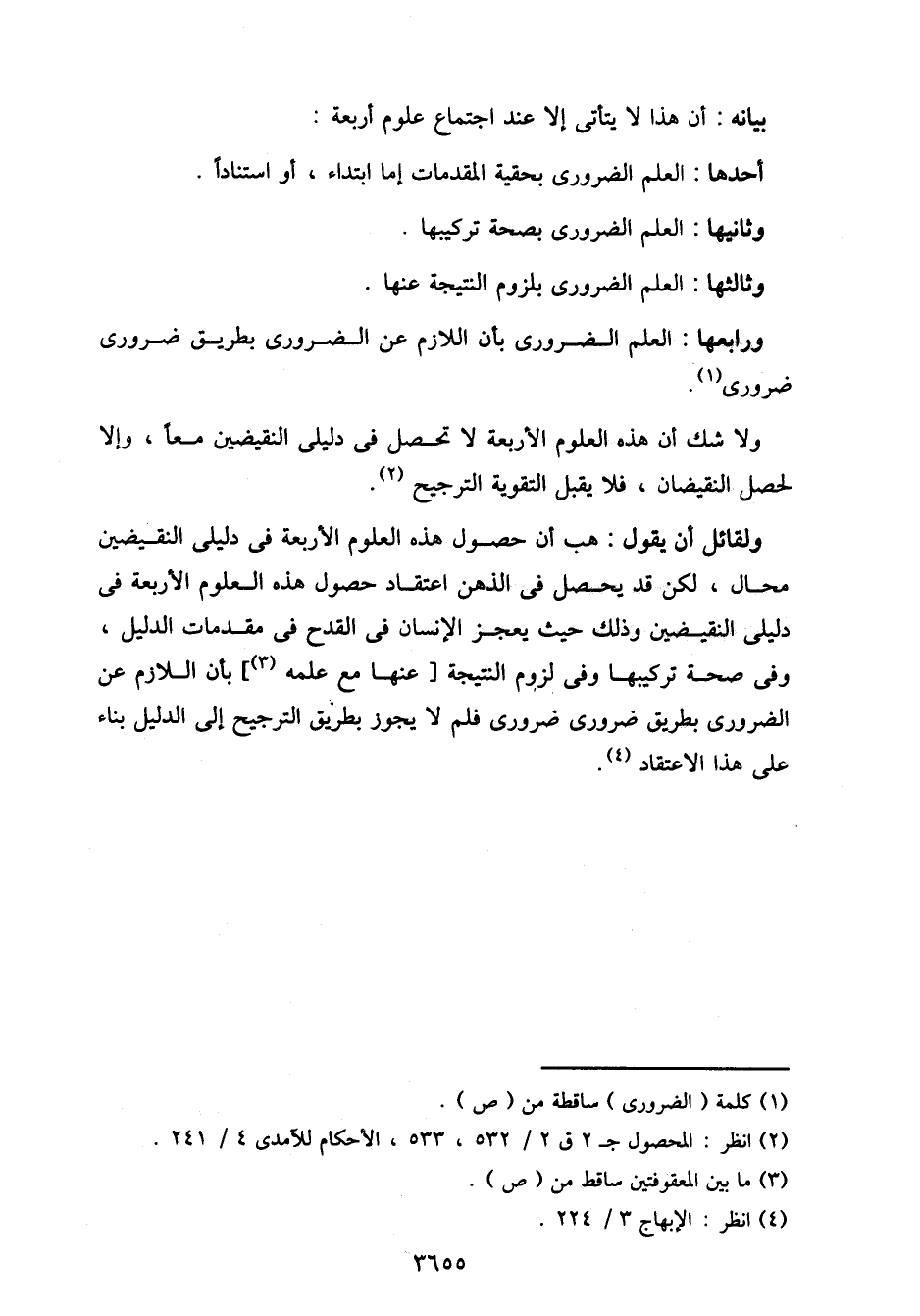 ولقائل أن يقول: هب أن حصول هذه العلوم الاربعة في دليلي النقيضين محال، لكن قد يحصل في الذهن اعتقاد حصول هذه العلوم الاربعة في دليلي النقيضين وذلك حيث يعجز الإنسان في القدح في مقدمات الدليل، وفى صحة تركيبها وفى لزوم النتيجة [عنها مع علمه]، بأن اللازم عن الضروري بطريق ضروري ضروري فلم لا يجوز بطريق الترجيح إلى الدليل بناء على هذا الاعتقاد.