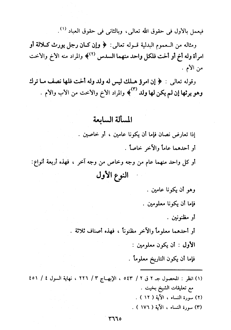 ومثاله من العموم البدلية قوله تعالى: {وإن كان رجل يورث كلالة أو امرأة وله أخ أو أخت فلكل واحد منهما السدس} والمراد منه الأخ والأخت من الأم.