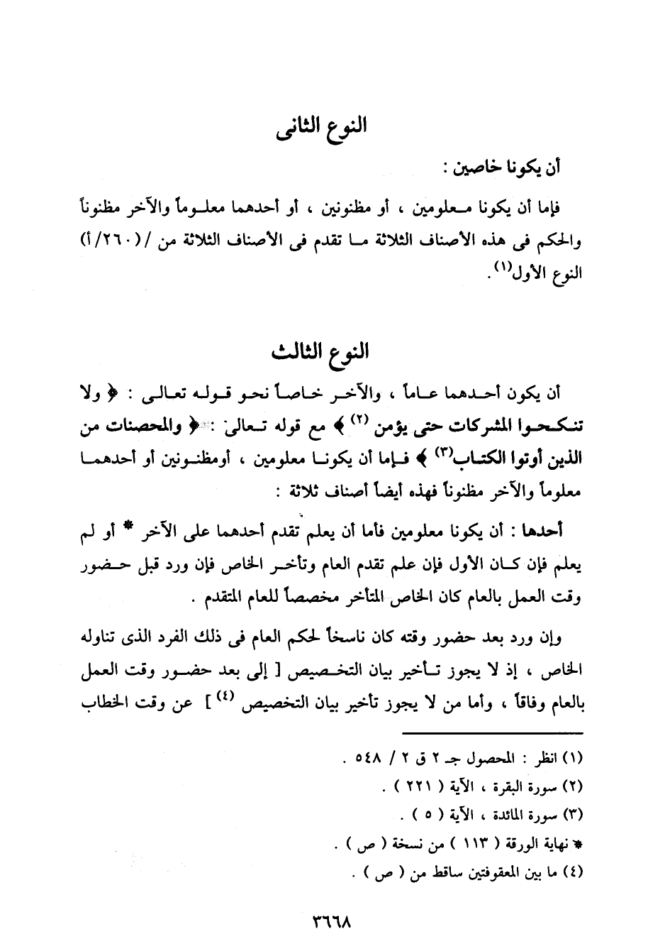 أن يكون أحدهما عامًا، والآخر خاصًا نحو قوله تعالى: {ولا تنكحوا المشركات حتى يؤمن} مع قوله تعالى: {والمحصنات من الذين أوتوا الكتاب} فإما أن يكونا معلومين، أو مظنونين أو أحدهما معلومًا والآخر مظنونًا فهذه أيضًا أصناف ثلاثة: