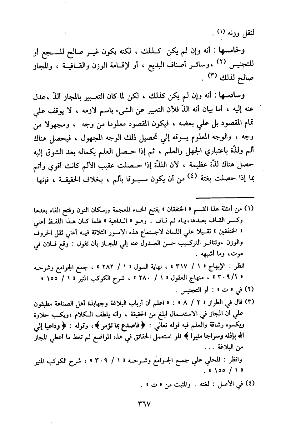 وسادسها: أنه وإن لم يكن كذلك، لكن لما كان التعبير بالمجاز ألذ، عدل عنه إليه، أما بيان أنه ألذ فلأن التعبير عن الشيء باسم لازمه، لا يوقف على تمام المقصود بل على بعضه، فيكون المقصود معلوما من وجه، ومجهولا من وجه، والوجه المعلوم يسوقه إلى تحصيل ذلك الوجه المجهول، فيحصل هناك ألم ولذة باعتباري الجهل والعلم، ثم إذا حصل العلم بكماله بعد الشوق إليه حصل هناك لذة عظيمة، لأن اللذة إذا حصلت عقيب الألم كانت أقوى وأتم بما إذا حصلت بغتة من أن يكون مسبوقا بألم، بخلاف الحقيقة، فإنها