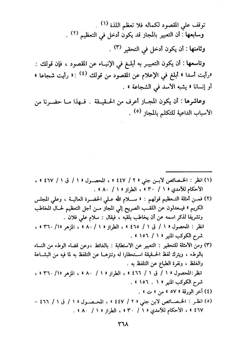 وعاشرها: أن يكون المجاز أعرف من الحقيقة. فهذا ما حضرنا من الأسباب الداعية للتكلم بالمجاز.