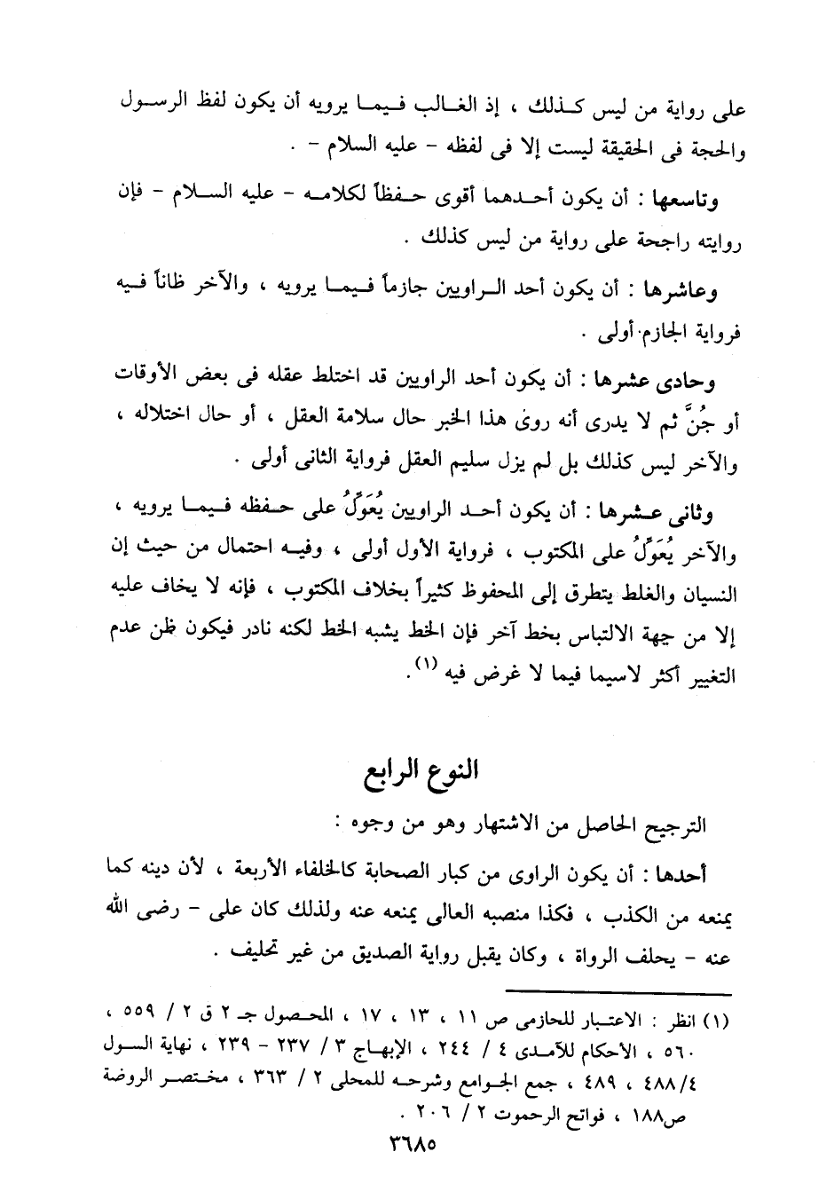 وثاني عشرها: أن يكون أحد الراوين يعول على حفظه فيما يرويه، والآخر يعول على المكتوب، فرواية الأول أولى، وفيه احتمال من حيث إن النسيان والغلط يتطرق إلى المحفوظ كثيرًا بخلاف المكتوب، فإنه لا يخاف عليه إلا من جهة الالتباس بخط آخر فإن الخط يشبه الخط لكنه نادر فيكون ظن عدم التغيير أكثر لاسيما فيما لا غرض فيه.