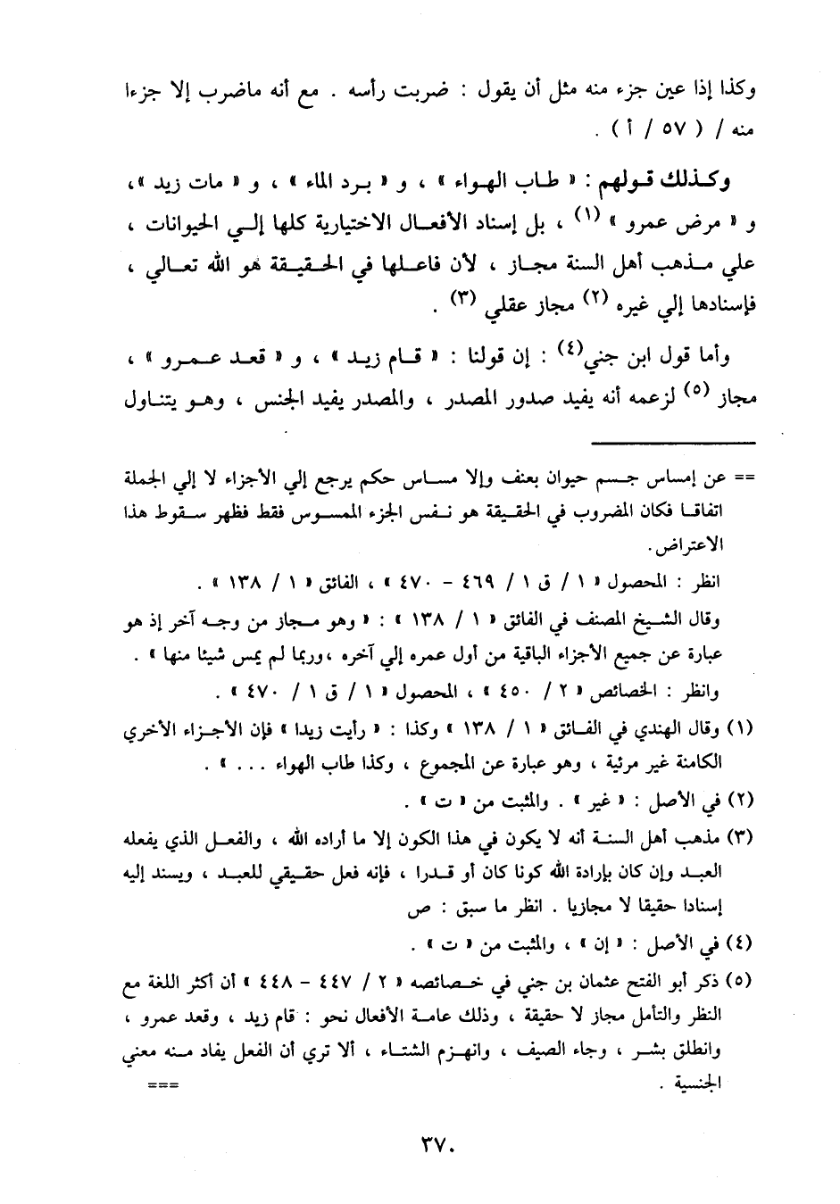 وأما قول ابن جني: إن قولنا: "قام زيد"، و "قعد عمرو"، مجاز لزعمه أنه يفيد صدور المصدر، والمصدر يفيد الجنس، وهو يتناول