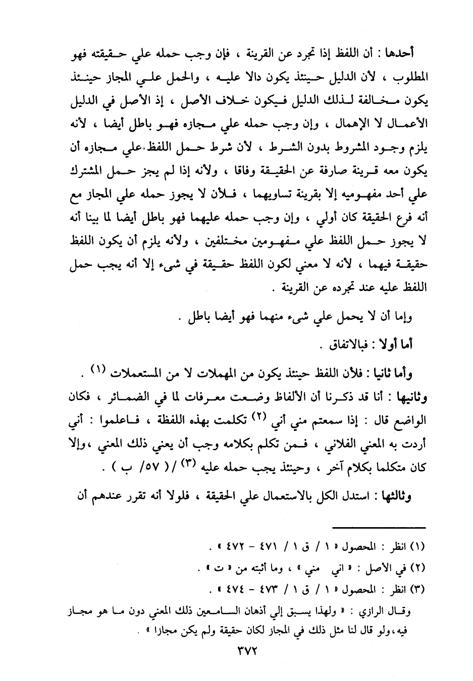 أحدها: أن اللفظ إذا تجرد عن القرينة، فإن وجب حمله على حقيقته فهو المطلوب، لأن الدليل حينئذ يكون دالا عليه، والحمل على المجاز حينئذ يكون مخالفة لذلك الدليل فيكون خلاف الأصل، إذ الأصل في الدليل الأعمال لا الإهمال، وإن وجب حمله على مجازه فهو باطل أيضا، لأنه يلزم وجود المشروط بدون الشرط، لأن شرط حمل اللفظ على مجازه أن يكون معه قرينة صارفة عن الحقيقة وفاقا، ولأنه إذا لم يجز حمل المشترك على أحد مفهوميه إلا بقرينة تساويهما، فلأن لا يجوز حمله على المجاز مع أنه فرع الحقيقة كان أولى، وإن وجب حمله عليهما فهو باطل أيضا لما بينا أنه لا يجوز حمل اللفظ على مفهومين مختلفين، ولأنه يلزم أن يكون اللفظ حقيقة فيهما، لأنه لا معنى لكون اللفظ حقيقة في شيء إلا أنه يجب حمل اللفظ عليه عن تجرده عن القرينة.
