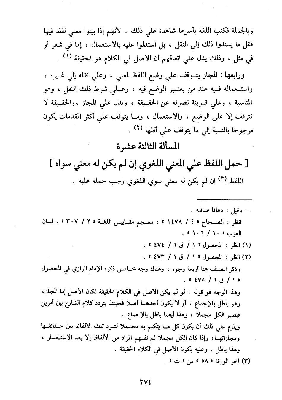 وبالجملة فكتب اللغة بأسرها شاهدة على ذلك. لأنهم إذا بينوا معنى لفظ فيها فقل ما يسندوا ذلك إلى النقل، بل استدلوا عليه بالاستعمال، إما في شعر أو في مثل، وذلك يدل على اتفاقهم أن الأصل في الكلام هو الحقيقة.