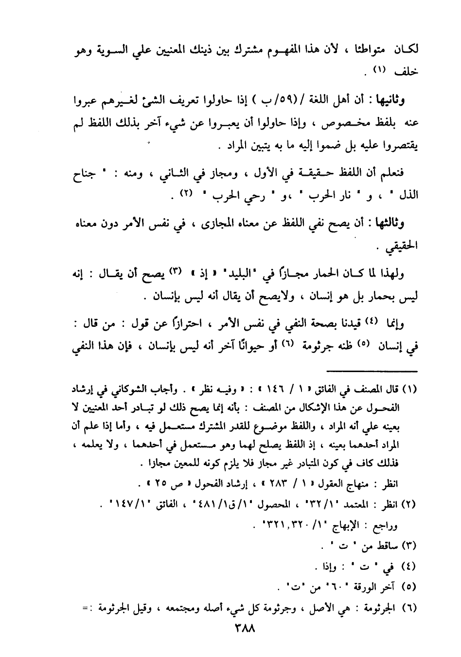 ولهذا لما كان الحمار مجازا في "البليد" "إذ" يصح أن يقال: إنه ليس بحمار بل هو إنسان، ولا يصح أن يقال أنه ليس بإنسان.