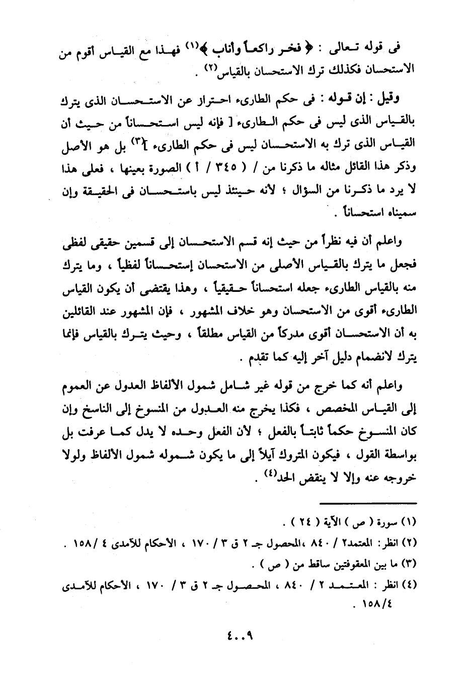 وقيل: إن قوله: في حكم الطارئ احتراز عن الاستحسان الذي يترك بالقياس الذي ليس في حكم الطارئ [فإنه ليس استحسانًا من حيث أن القياس الذي ترك به الاستحسان ليس في حكم الطارئ] بل هو الأصل وذكر هذا القائل مثاله ما ذكرنا من/ (345/ أ) الصورة بعينها، فعلى هذا لا يرد ما ذكرنا من السؤال؛ لأنه حينئذ ليس باستحسان في الحقيقة وإن سميناه استحسانًا.