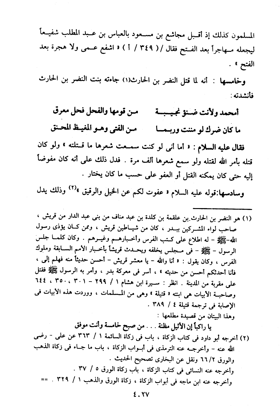 وخامسها: أنه لما قتل النضر بن الحارث جاءته بنت النضر بن الحارث فأنشدته: