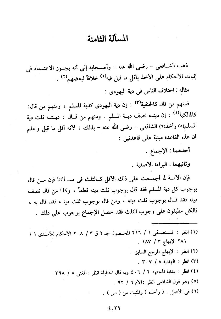 فإن الأمة لما أجمعت على ذلك الأقل كالثلث في مسألتنا فإن من قال بوجوب كل دية المسلم فقد قال بوجوب ثلث ديته قطعًا، وكذا من قال نصف ديته فقد قال بوجوب ثلث ديته، من قال بوجوب ثلث ديته فقد قال به، فالكل مطبقون على وجوب الثلث فقد حصل الإجماع بوجوب على ذلك.