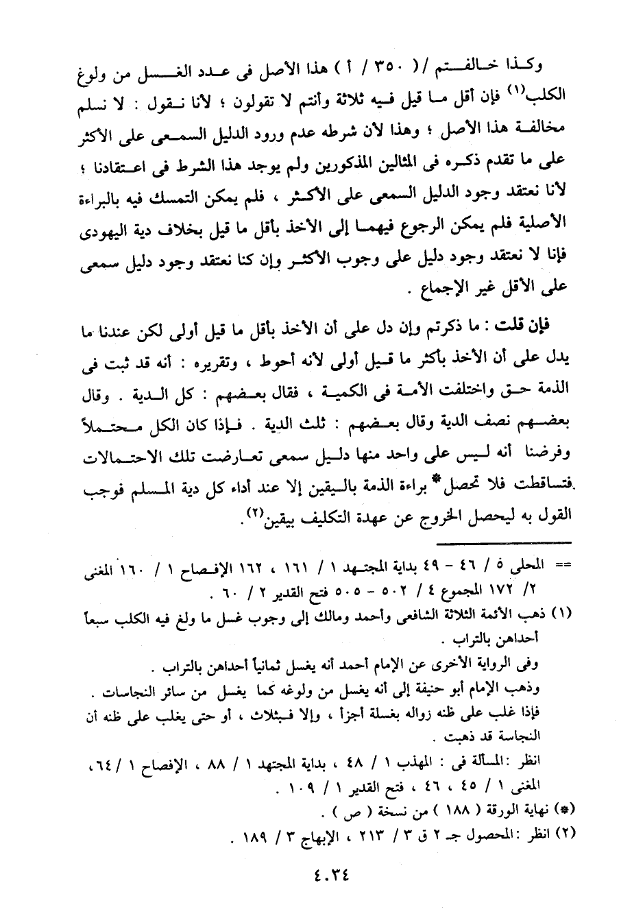 وكذا خالفتم/ (350/ أ) هذا الأصل في عدد الغسل من ولوغ الكلب فإن أقل ما قيل فيه ثلاثة وأنتم لا تقولون؛ لأنا نقول: لا نسلم مخالفة هذا الأصل؛ وهذا لأن شرطه عدم ورود الدليل السمعي على الأكثر على ما تقدم ذكره في المثالين المذكورين ولم يوجد هذا الشرط في اعتقادنا؛ لأنا نعتقد وجود الدليل السمعي على الأكثر، فلم يمكن التمسك بالبراءة الأصلية فلم يمكن الرجوع فيهما إلى الأخذ بأقل ما قيل بخلاف دية اليهودي فإنا لا نعتقد وجود دليل على وجوب الأكثر وإن كنا نعتقد وجود دليل سمعي على الأقل غير الإجماع.