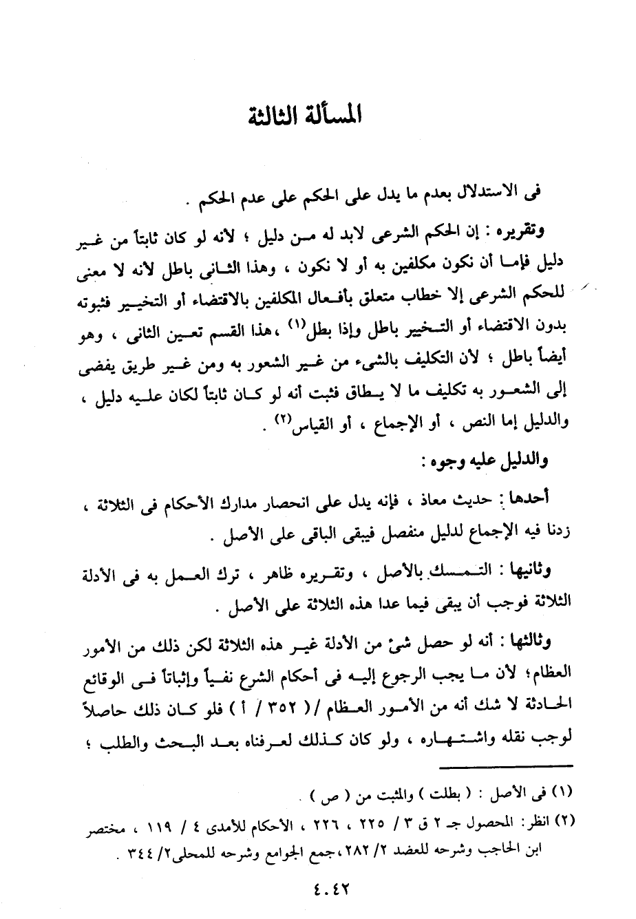 وتقريره: إن الحكم الشرعي لابد له من دليل؛ لأنه لو كان ثابتًا من غير دليل فإما أن نكون مكلفين به أو لا نكون، وهذا الثاني باطل لأنه لا معنى للحكم الشرعي إلا خطاب متعلق بأفعال المكلفين بالاقتضاء أو التخيير فثبوته بدون الاقتضاء أو التخيير باطل وإذا بطل، هذا القسم تعين الثاني، وهو أيضًا باطل؛ لأن التكليف بالشيء من غير الشعور به ومن غير طريق يفضي إلى الشعور به تكليف ما لا يطاق فثبت أنه لو كان ثابتًا لكان عليه دليل، والدليل إما النص، أو الإجماع، أو القياس.