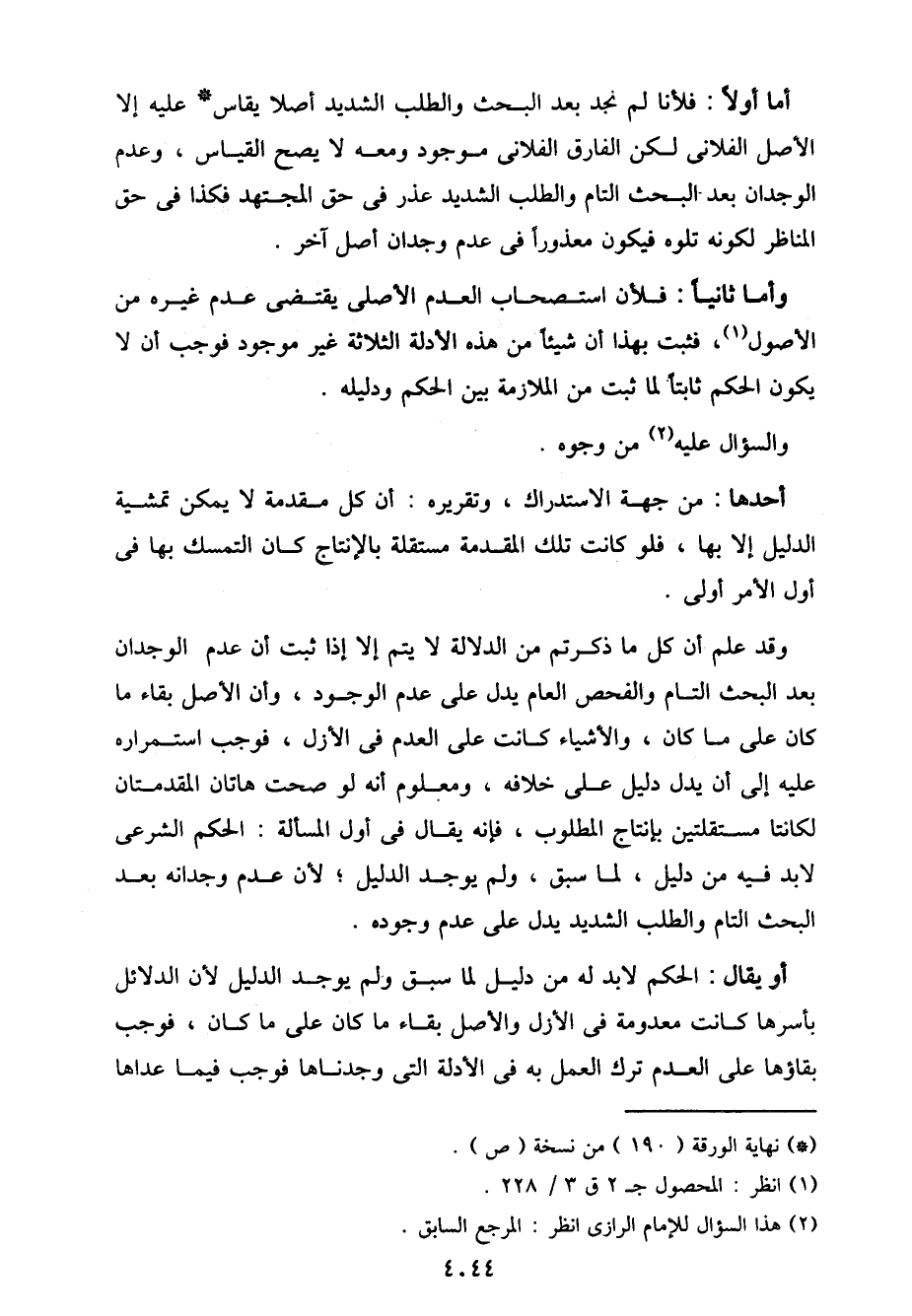 وأما ثانيًا: فلأن استصحاب العدم الأصلي يقتضي عدم غيره من الأصول، فثبت بهذا أن شيئًا من هذه الأدلة الثلاثة غير موجود فوجب أن لا يكون الحكم ثابتًا لما ثبت من الملازمة بين الحكم ودليله.