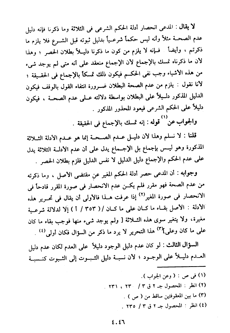 وجوابه: أن المدعى حصر أدلة الحكم المغير عن مقتضى الأصل، وما ذكرته من عدم الصحة فهو مقرر فلم يكن عدم الانحصار في صورة المقرر قادحًا في الانحصار في صورة المغير إذا عرفت هذا فالأولى أن يقال في تحرير هذه الأدلة: الأصل بقاء ما كان على ما كان/ (353/ أ) إلا لدلالة شرعية مغيرة، ولا يتغير سوى هذه الثلاثة [ولو يوجد شيء منها فوجب بقاء ما كان على ما كان وعلى] هذا التحرير لا يرد ما ذكر من السؤال فكان أولى.