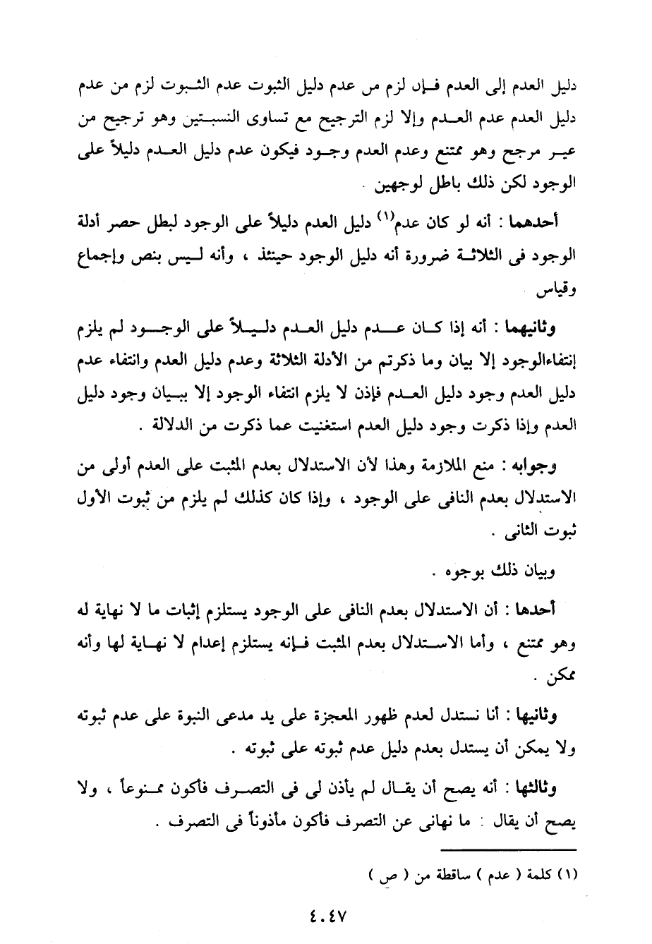 أحدها: أن الاستدلال بعدم النافي على الوجود يستلزم إثبات ما لا نهاية له وهو ممتنع، وأما الاستدلال بعدم المثبت فإنه يستلزم إعدام لا نهاية لها وأنه ممكن.