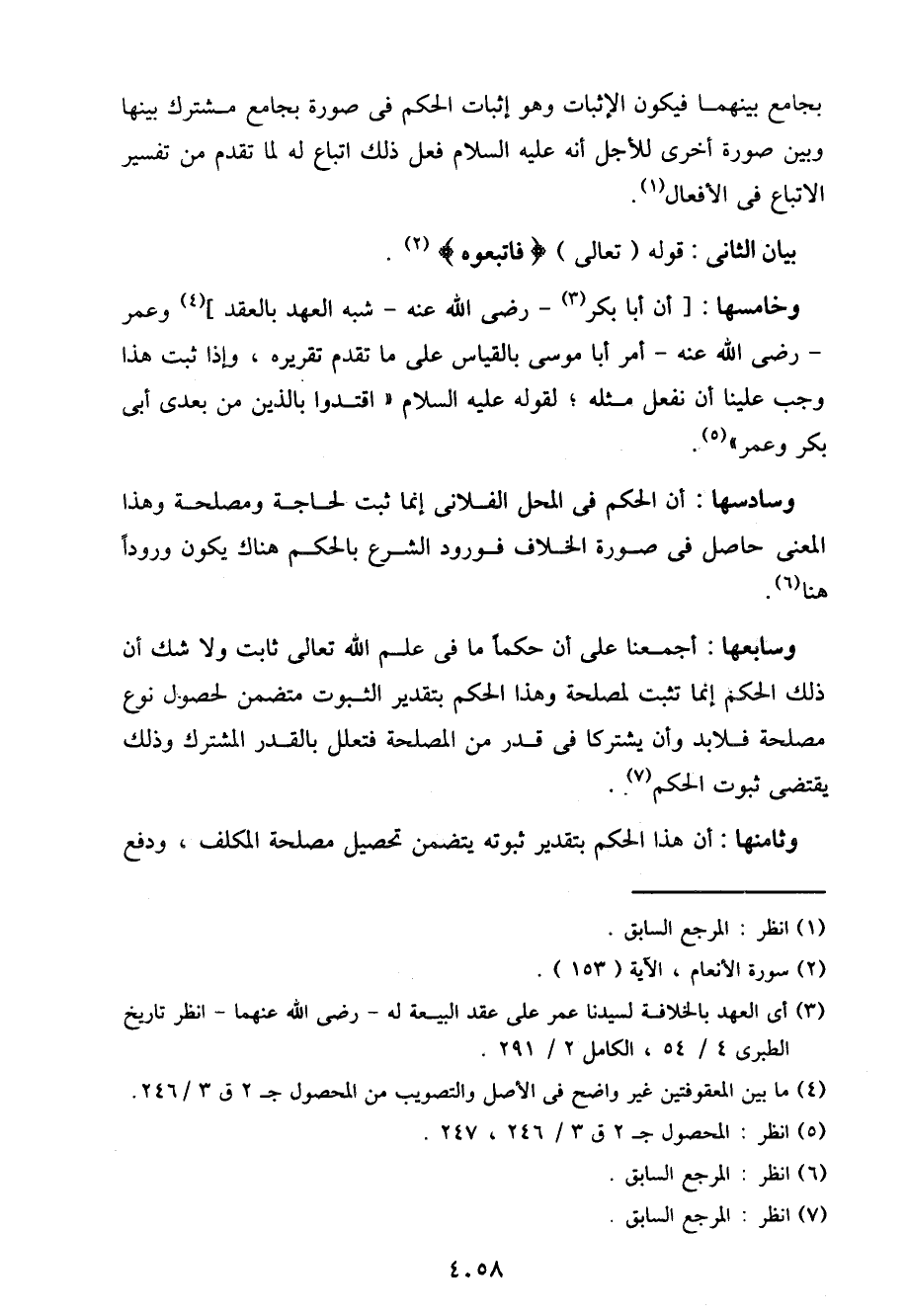 وخامسها: [أن أبا بكر -رضي الله عنه- شبه العهد بالعقد] وعمر -رضي الله عنه- أمر أبا موسى بالقياس على ما تقدم تقريره، وإذا ثبت هذا وجب علينا أن نفعل مثله؛ لقوله عليه السلام "اقتدوا بالذين من بعدي أبي بكر وعمر".