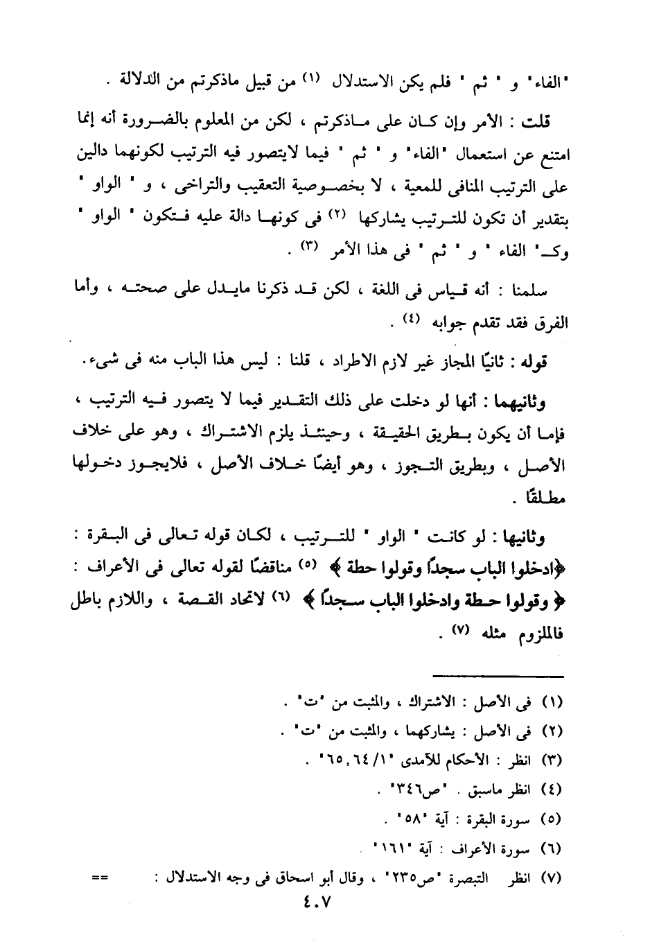 وثانيها: لو كانت "الواو" للترتيب، لكان قوله تعالى في البقرة: {ادخلوا الباب سجدا وقولوا حطة} مناقضا لقوله تعالى في الأعراف: {وقولوا حطة وادخلوا الباب سجدا} لاتحاد القصة، واللازم باطل فالملزوم مثله.
