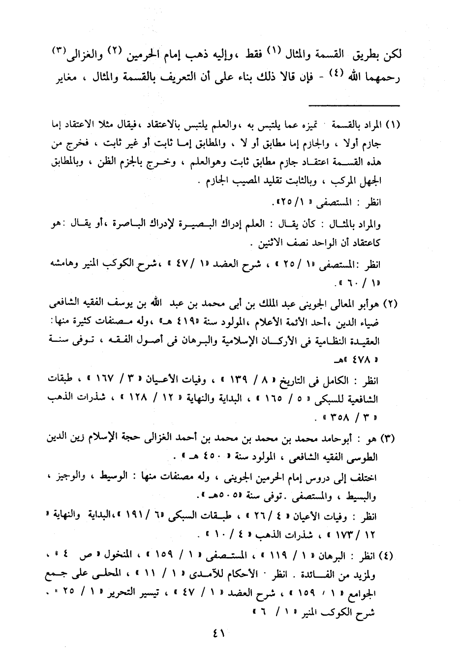 لكن بطريق القسمة والمثال فقط، وإليه ذهب إمام الحرمين والغزالي رحمهما الله- فإن قالا ذلك بناء على أن التعريف بالقسمة والمثال، مغاير