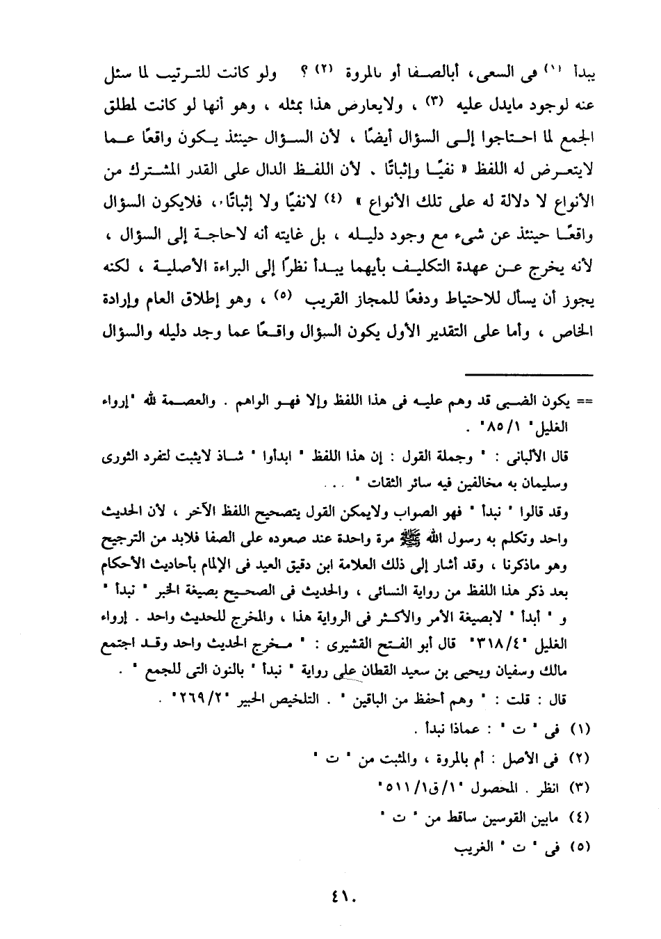 يبدأ في السعي، أبالصفا والمروة؟ ولو كانت للترتيب لما سئل عنه لوجود ما يدل عليه، ولا يعارض هذا بمثله، وهو أنها لو كانت لمطلق الجمع لما احتاجوا إلى السؤال أيضا، لأن السؤال حينئذ يكون واقعا عما لا يتعرض له اللفظ "نفيا وإثباتا، لأن اللفظ الدال على القدر المشترك من الأنواع لا دلالة له على تلك الأنواع" لا نفيا ولا إثباتا، فلا يكون السؤال واقعا حينئذ عن شيء مع وجود دليله، بل غايته أنه لا حاجة إلى السؤال، لأنه يخرج عن عهدة التكليف بأيهما يبدأ نظرا إلى البراءة الأصلية، لكنه يجوز أن يسأل للاحتياط ودفعا للمجاز القريب، وهو إطلاق العام وإرادة الخاص، وأما على التقدير الأول يكون السؤال واقعا عما وجد دليله والسؤال