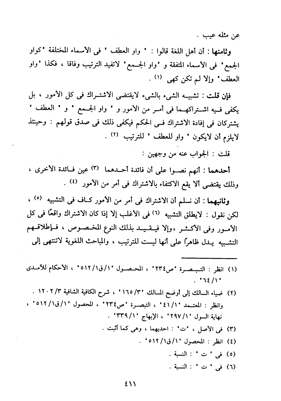 وثانيهما: أن نسلم أن الاشتراك في أمر من الأمور كاف في التشبيه، لكن نقول: لا يطلق التشبيه في الأغلب إلا إذا كان الاشتراك واقعا في كل الأمور وفي الأكثر، وإلا فيقيد بذلك النوع المخصوص، فإطلاقهم التشبيه يدل ظاهرا على أنها ليست للترتيب، والمباحث اللغوية لا تنتهي إلى