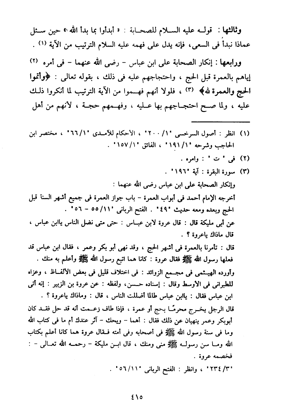 ورابعها: إنكار الصحابة على ابن عباس- رضي الله عنهما- في أمره إياهم بالعمرة قبل الحج، واحتجاجهم عليه في ذلك، بقوله تعالى: {وأتموا الحج والعمرة لله}، فولا أنهم فهموا من الآية الترتيب لما أنكروا ذلك عليه، ولما صح احتجاجهم بها عليه، وفهمهم حجة، لأنهم من أهل